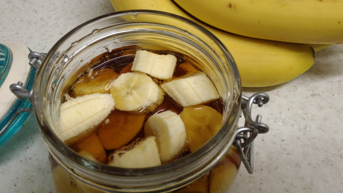 - Cho đường và chuối vào lọ, sau đó đổ giấm vào