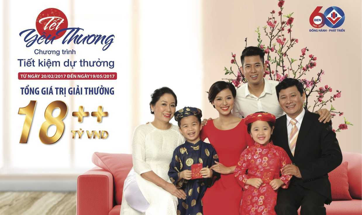 Đặc biệt hơn, trong dịp đầu xuân năm mới Đinh Dậu 2017, thay lời tri ân đến khách hàng đã tin tưởng và lựa chọn, BIDV triển khai chương trình tiết kiệm dự thưởng "Tết Yêu Thương 2017” từ ngày 20/02/2017 đến ngày 19/05/2017 với tổng giá trị giải thưởng trên 18 tỷ đồng. Theo đó, khách hàng khi tham gia chương trình sẽ có tận 4 cơ hội nhận quà: Quà tặng ngay trị giá 50.000 VND/giao dịch với số tiền gửi tối thiểu 100.000.000VND; Quay số trúng thưởng hàng tuần với 5 giải mỗi tuần, trong 8 tuần, với mỗi giải là 1 chiếc điện thoại iPhone 7 Plus 32GB; Quay số trúng thưởng tuần vàng tri ân nhân kỷ niệm ngày Quốc tế phụ nữ 8/3 với 10 giải may mắn là 10 chiếc điện thoại iPhone 7 32GB. Đặc biệt cơ cấu giải thưởng quay số may mắn cuối tuần với cơ hội trúng 1 trong 2 chiếc Hyundai Grand I10 sedan. Thể lệ chương trình chi tiết tại website www.bidv.com.vn.