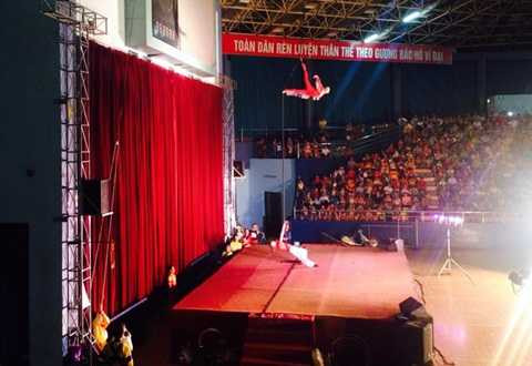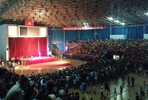 | Hàng ngàn khán giả theo dõi chương trình bên sân khấu sơ sài bên trong Nhà thi đấu tỉnh Vĩnh Phúc |