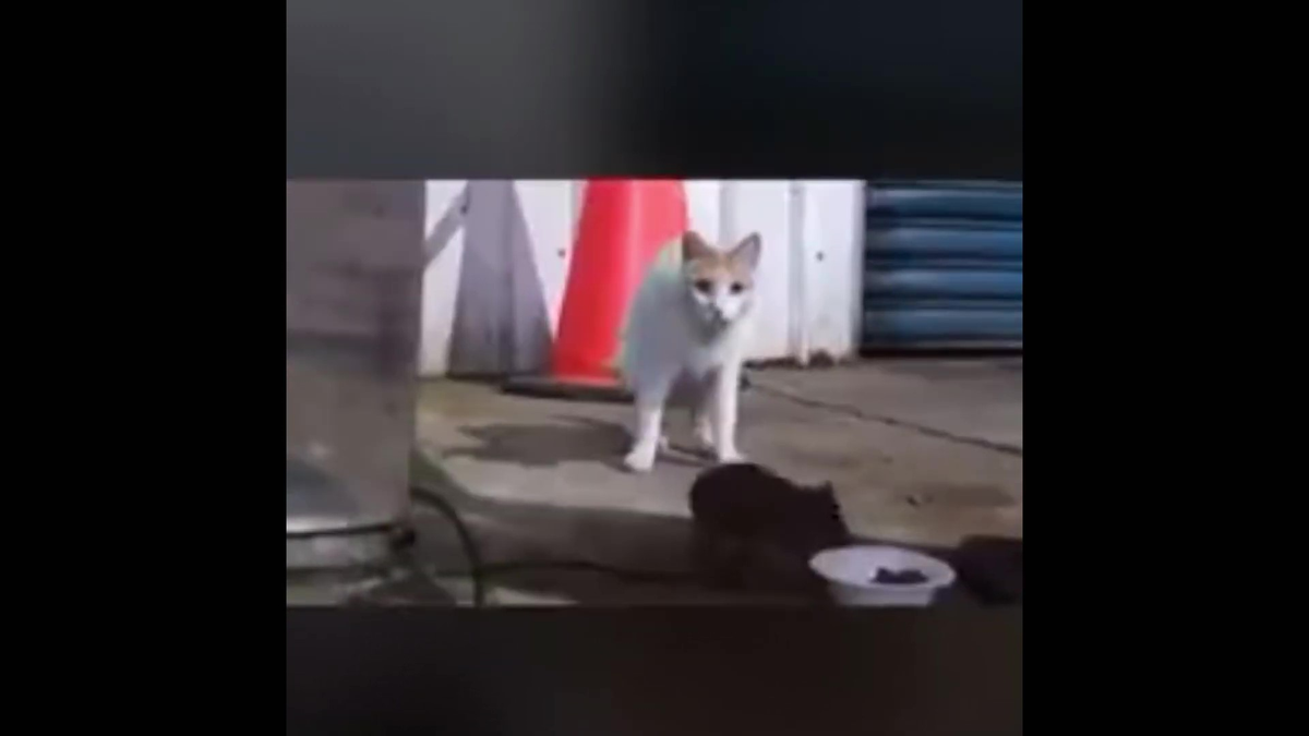 Mèo đang ăn thì chuột từ đâu mò đến, hung hăng đánh đuổi mèo rồi ngang nhiên cướp đĩa thức ăn, mèo chỉ biết ngậm ngùi bỏ đi.