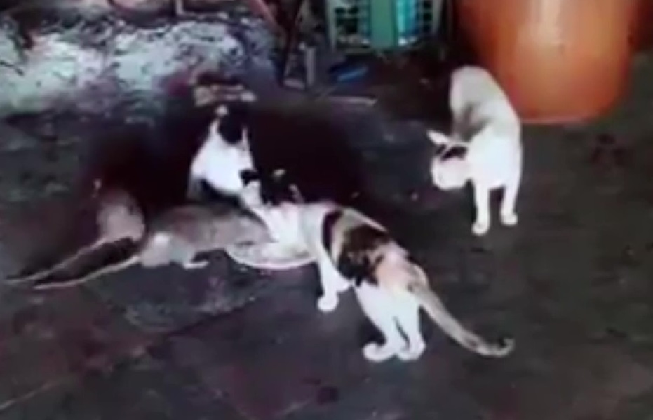 Chuột thản nhiên dùng bữa cùng đàn mèo