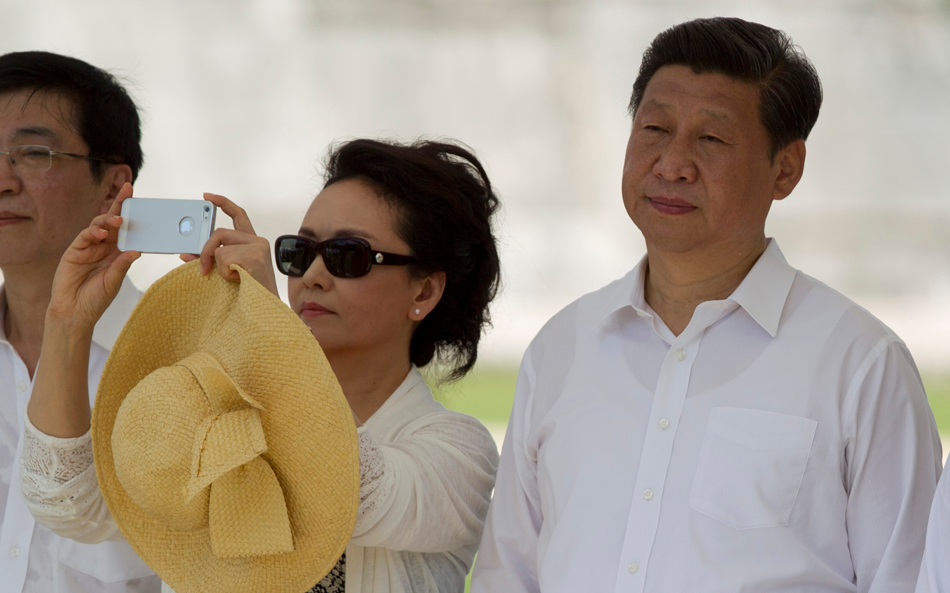 Trong tấm ảnh đặc biệt này, bà Bành Lệ Viện trông rất sành điệu khi mặc áo trắng, đeo kính râm đen. Một tay bà giữ chiếc mũ rộng vành màu vàng nhạt, một tay bà cầm chiếc iPhone, được cho là iPhone 5 để chụp ảnh. Bà đứng ngay cạnh ông Tập Cận Bình.