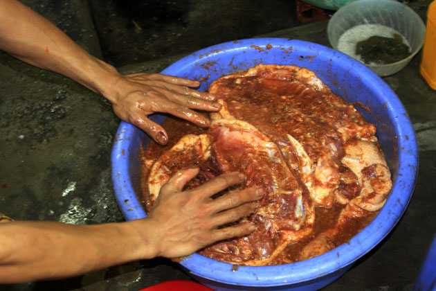 Để cho nhanh và tiện, các công đoạn chế biến cũng như tẩm ướp đều được chủ quán làm bằng tay