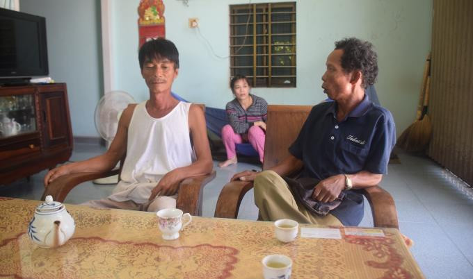 Anh Minh (bên trái) kể lại chuyện với hàng xóm đến thăm hỏi. Ảnh: V.Đ.T.