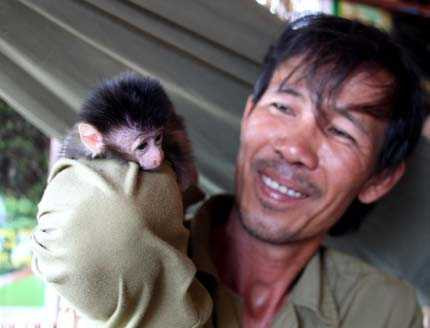| Tác giả và một chú khỉ nhỏ bị thợ săn tóm ở ngã ba biên giới, thuộc xã Sín Thầu (Mường Nhé, Điện Biên). Mẹ của chú khỉ này đã bị thợ săn bắn hạ. Mẹ nó bị trúng đạn, rơi xuống đất, mà nó cứ ôm bụng mẹ không rời. |