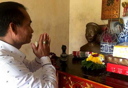 Một bên ban thờ là tượng mẹ, một bên là di ảnh bố đẻ tiến sĩ Nguyễn Thy Sơn