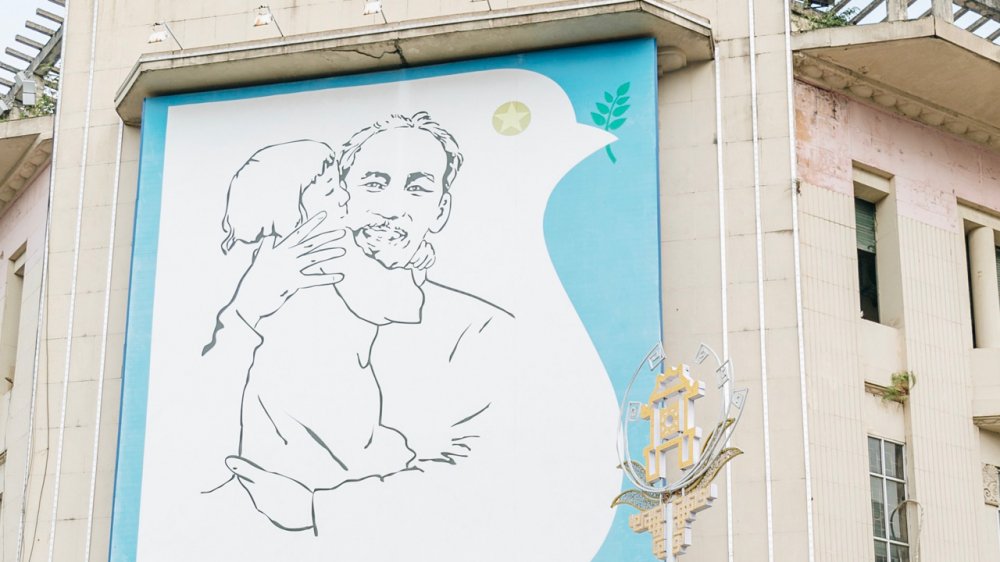 Câu chuyện đằng sau bức tranh vẽ Chủ tịch Hồ Chí Minh bế một em bé lồng trong hình ảnh cánh chim hòa bình ở ngã tư Tràng Tiền, ngay cạnh Hồ Gươm (Hà Nội).