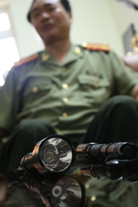 | Đại tá Cường và một số dụng cụ chuyên dụng của lực lượng cảnh vệ - Ảnh: Thanh Phong |