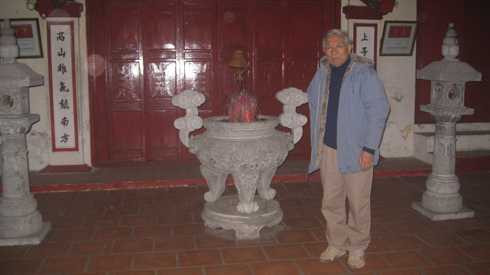 | Cụ Trà bên ngôi đình thờ Phúc Thần Nguyễn Hy Quang. |