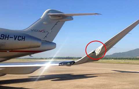 | Vết rách cánh máy bay CL350 tại sân bay Đà Nẵng (Ảnh: Thanh Niên) |