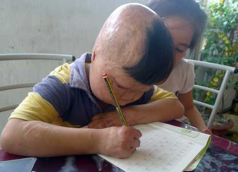 | May mắn, bàn tay chỉ còn 4 ngón và tháo gần hết đốt vẫn có thể cầm bút. |