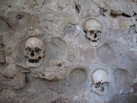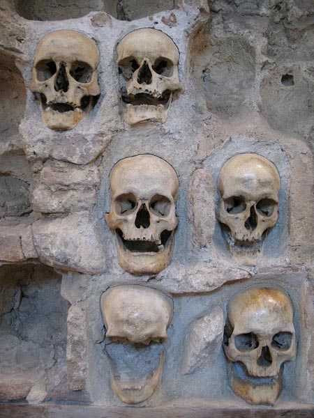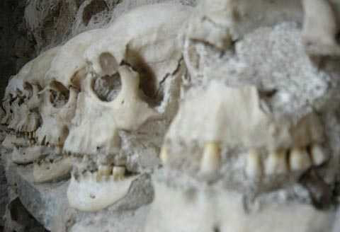 | Cận cảnh những chiếc sọ người được dùng để xây tháp |