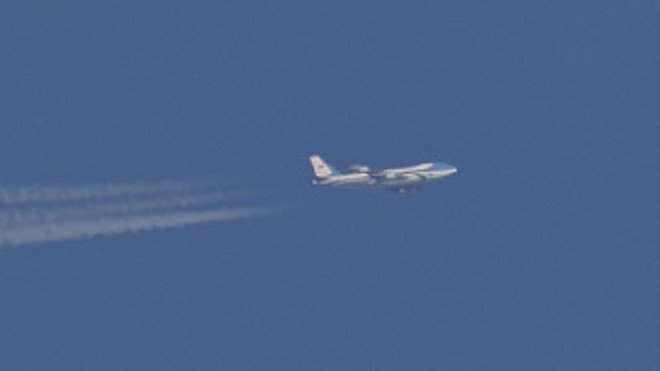Máy bay chở Tổng thống Trump xuất hiện trên không phận Anh. (Ảnh: Alan Meloy/Flickr)