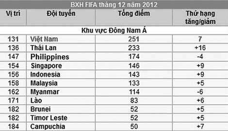Việt Nam tiếp tục giữ vững ngôi vị số 1 khu vực Đông Nam Á sau khi tăng 7 bậc trên Bảng xếp hạng tháng 12/2012. Tin từ FIFA bay về chẳng khác nào làn gió mát lành xua tan đi không khí ngột ngạt đang ngự trị ở bóng đá Việt.