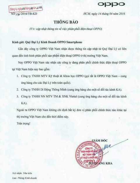 Trong khi đó, hôm qua Oppo Việt Nam đã gửi đi một thông báo đến các đại lý, cho biết hiện nay tại Việt Nam chỉ có 3 đơn vị được công ty ủy quyền phân phối chính thức. Gồm: Công ty TNHH MTV Kỹ thuật & Khoa học Oppo (gọi tắt là Oppo Việt Nam), Công ty TNHH NN MTV TM&XNK Viettel, Công ty TNHH Di Động Thông Minh. Theo các đại lý bán lẻ, hầu hết điện thoại Oppo hiện nay ở Việt Nam đều do Oppo Việt Nam phân phối, hai công ty kia phân phối rất ít.