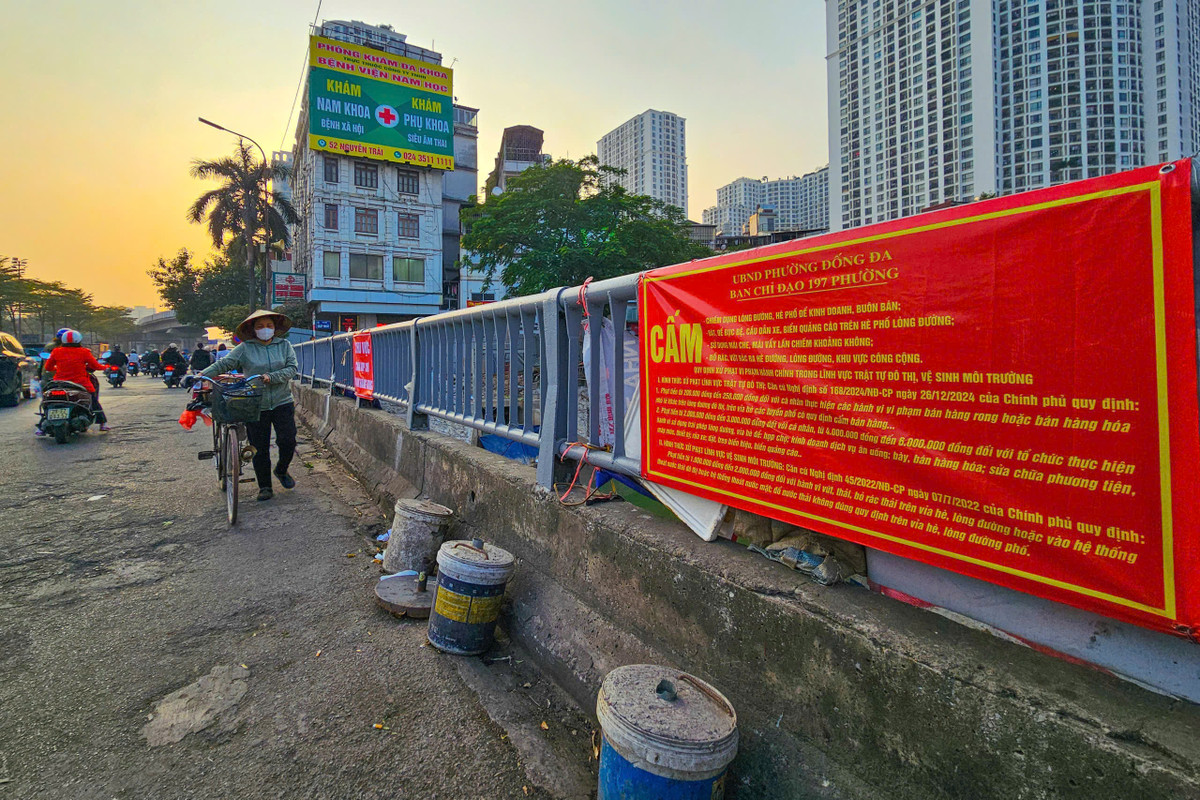 Khu vực gần Ngã Tư Sở – điểm nóng chợ cóc, buôn bán lấn chiếm vỉa hè trước đây, nay đã được rào chắn, treo biển cấm họp chợ, trả lại không gian thông thoáng cho người đi bộ và phương tiện giao thông.