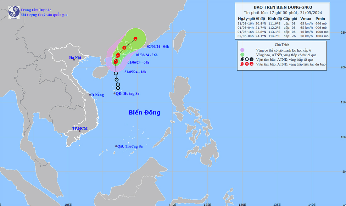 Ông Nguyễn Văn Hưởng, Trưởng phòng Dự báo thời tiết, Trung tâm Dự báo khí tượng thuỷ văn quốc gia cho biết, theo dự báo, trong 12 giờ tới, bão số 1 di chuyển chủ yếu theo hướng Bắc, khả năng trong đêm nay và sáng sớm mai 1/6, cơn bão sẽ đổ bộ vào phía Nam tỉnh Quảng Đông (Trung Quốc).