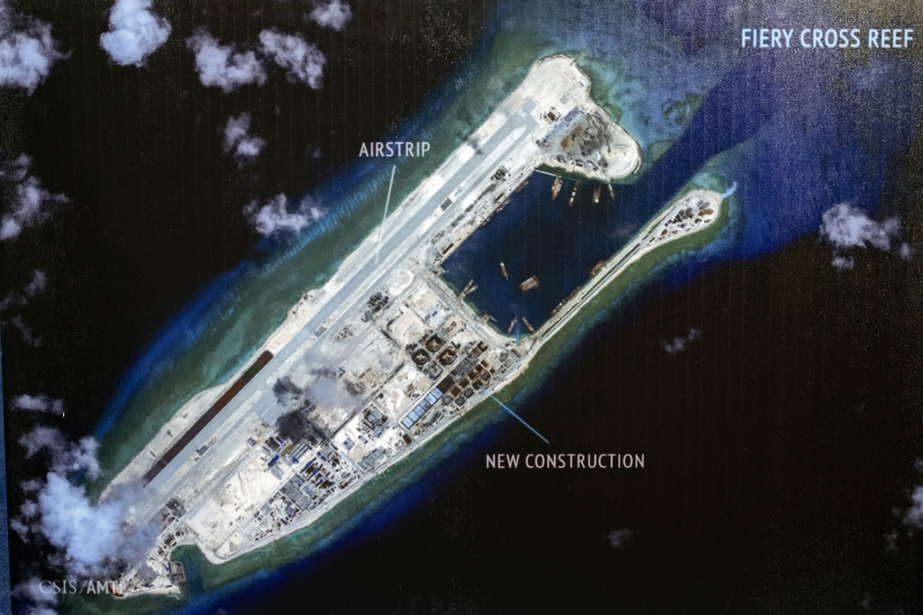Đá Chữ Thập, thực thể thuộc quần đảo Trường Sa bị Trung Quốc chiếm đóng và bồi đắp phi pháp. (Ảnh: CSIS/AMTI)