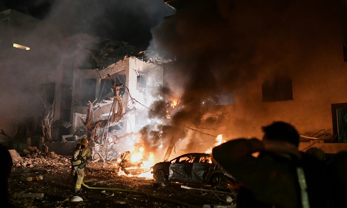 Lực lượng cứu hỏa dập lửa tại ngôi nhà bị trúng tên lửa Iran tại thành phố Tel Aviv. (Ảnh: AP)