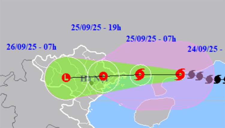 Trung tâm Dự báo khí tượng thuỷ văn quốc gia, tối nay 24/9, bão số 9 Ragasa tiếp tục suy yếu, còn mạnh cấp 12. Nửa đêm về sáng, gió và mưa sẽ tăng tại vùng ven biển Quảng Ninh-Hưng Yên, sau đó mưa to và gió mạnh mở rộng ra các khu vực khác ở Bắc Bộ, Thanh Hóa và Nghệ An. Trọng tâm gió trong sáng tới trưa 25/9, trọng tâm mưa trong ngày và đêm 25/9.