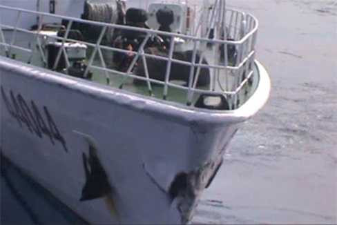| Tàu Hải cảnh 44044 Trung Quốc bị vỡ mũi tàu sau khi đâm thẳng vào tàu Cảnh sát biển Việt Nam |