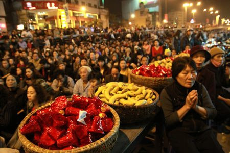 Người dân tràn ra đường dâng sao giải hạn ở chùa Phúc Khánh. (Ảnh: Zing.vn)