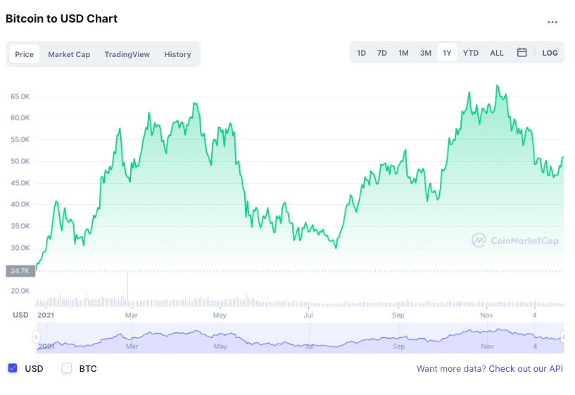 Giá Bitcoin trồi sụt mạnh trong vòng một năm qua. Hôm 10/11, giá thiết lập kỷ lục mới gần 69.000 USD/đồng. Ảnh: CoinMarketCap. |