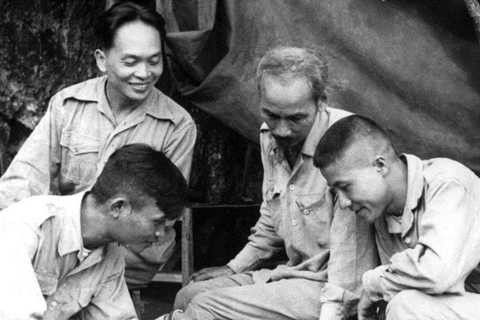 | Chủ tịch Hồ Chí Minh và Đại tướng, Tổng tư lệnh Võ Nguyên Giáp bàn kế hoạch quân sự tại Sở chỉ huy Chiến dịch biên giới (năm 1950). Ảnh: Tư liệu TTXVN |