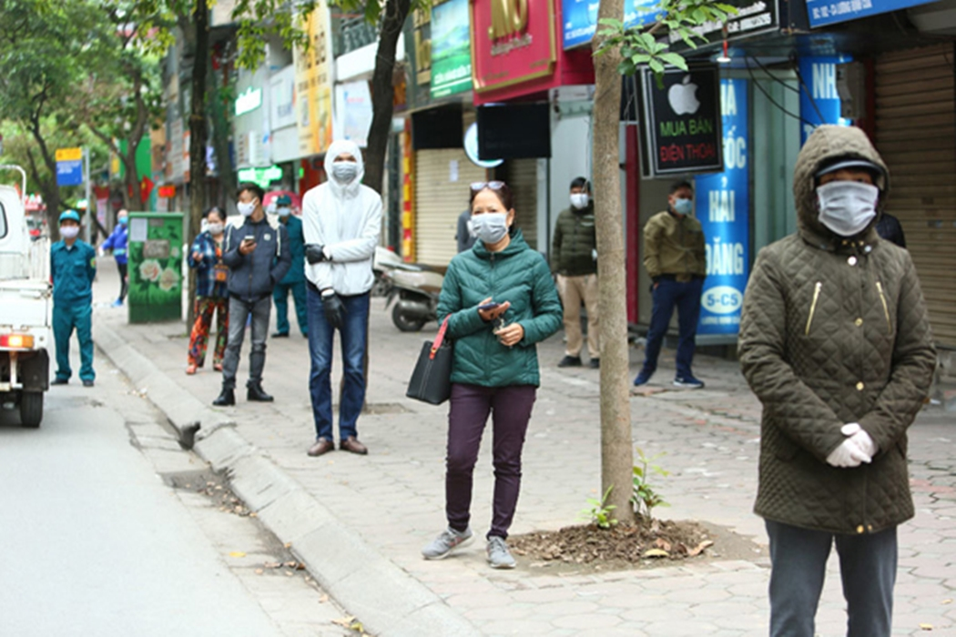 Người dân Quận Đống Đa, Hà Nội xếp hàng đảm bảo khoảng cách 2m chờ làm test nhanh Covid-19. (Ảnh: Vietnamnet)
