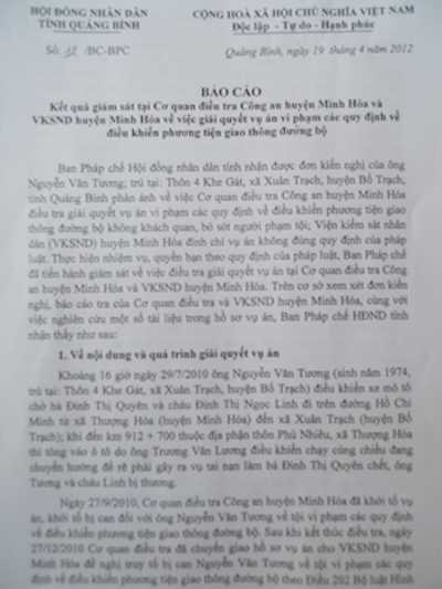 Ngày 27-9-2010, Cơ quan điều tra (CQĐT) Công an huyện Minh Hóa đã khởi tố vụ án, khởi tố bị can đối với anh Nguyễn Văn Tương về tội vi phạm các quy định về điều khiển phương tiện giao thông đường bộ.