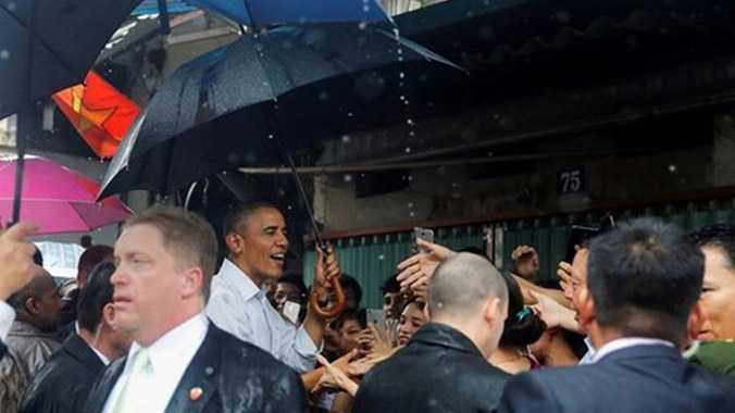 Tổng thống Mỹ trong cơn mưa ở làng Mễ Trì Hạ, Từ Liêm, Hà Nội chiều 24/5. Ảnh: Internet