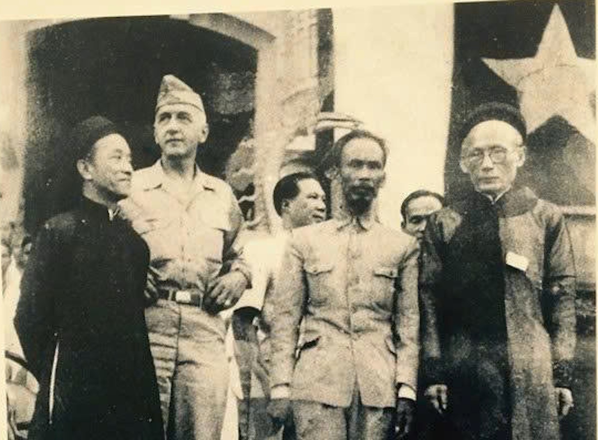 Bộ trưởng Nguyễn Văn Tố (ngoài cùng bên trái) và Chủ tịch Hồ Chí Minh lại lễ mít tinh vận động cứu đói tổ chức trước Nhà hát lớn Hà Nội năm 1945. (Ảnh Tư liệu)