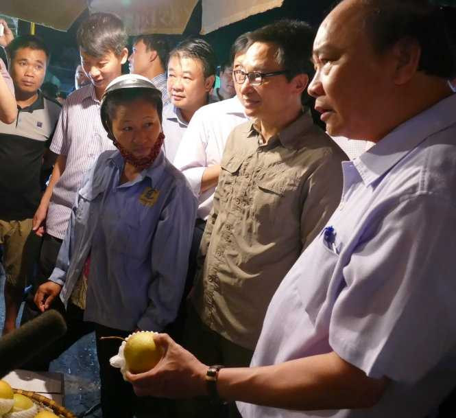 Với một tổ công tác rất gọn, không tiền hô hậu ủng, Thủ tướng đã bất ngờ gặp trực tiếp những người buôn bán, sản xuất để kiểm tra, thăm hỏi tình hình an toàn vệ sinh thực phẩm - Ảnh: LÊ KIÊN