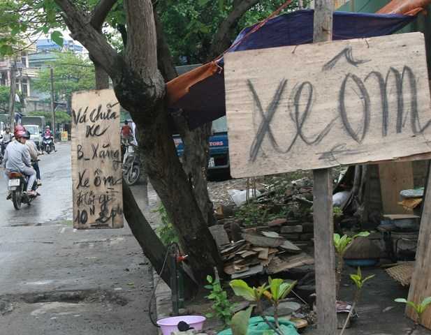 Tấm biển rộng khoảng 40 cm, dài hơn 70 cm được làm bằng gỗ dán màu trắng, chữ viết màu đen có dòng chữ: “Vá chữa xe, B_ xăng, Xe ôm, Hỏi gì 10N 2 ph” được treo trên một thân cây trên vỉa hè đối diện số nhà 66 Lĩnh Nam, phường Mai Động, Hoàng Mai, Hà Nội.