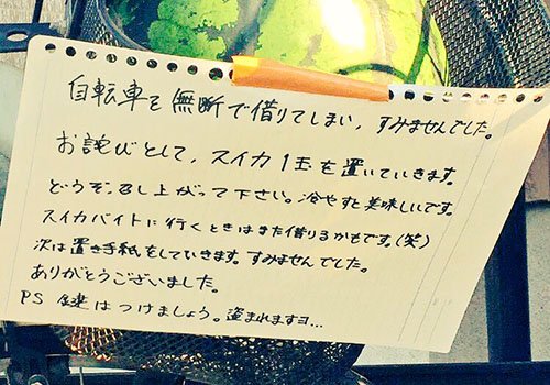 Ngoài ra, tên trộm còn nhắn nhủ lần sau chủ xe nên khóa cẩn thận. Sau khi nhận lại chiếc xe đạp cùng quà xin lỗi, người chủ không khỏi cảm thấy ngạc nhiên vì "môi trường sống ở Tokyo an toàn đến khó tin".
