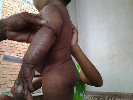 Theo quan sát của chúng tôi, hiện tại cháu bé đã bị nứt toàn thân, trong đó những nơi da non như cổ, háng, bụng nứt nhiều nhất. Đường nứt đan chéo, xếp lớp như vảy rắn, màu trắng bệch. Chỉ cần cháu bé cử động mạnh thì sẽ làm tổn thương bất cứ phần da nào của cơ thể.