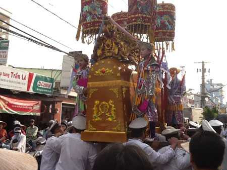 Khi hầu ma, do quan tài đặt ở trong nhà nên 4 "thần đèn" đứng chầu ở 4 góc áo quan ít được mọi người biết. Đến giờ di quan, sau khi nâng cỗ quan tài lên vai, các âm công lần lượt nâng 4 đứa trẻ để đứng lên 4 góc của quan tài và khiêng như thế từ nhà ra đến ngoài đường Đỗ Xuân Hợp, nơi có đoàn xe tang đợi sẵn. Dù khu vực đứng cạnh áo quan rất nhỏ hẹp, lại chông chênh nhưng có lẽ do quá quen với kiểu công kênh như thế này nên 4 đứa trẻ trụ rất vững, và không tỏ vẻ sợ hãi.