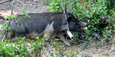 Để chúng không đi được xa, không chui rúc được vào rừng sâu, phá nương rẫy, đồng bào đeo cho chúng cái gông hình tam giác to tướng ở cổ. Có cái gông ấy, chúng chỉ loanh quanh kiếm ăn được ở chỗ đất trống, không sợ đi lạc.
