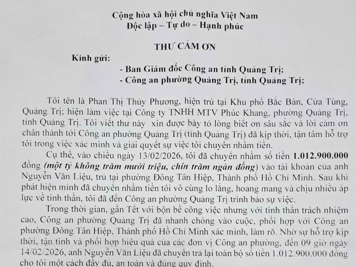 Công an tỉnh Quảng Trị cho biết, chị Phan Thị Thủy Phương (trú Cửa Tùng, Quảng Trị) vừa gửi thư tới Ban Giám đốc Công an tỉnh và Công an phường Quảng Trị bày tỏ lòng biết ơn sau khi được lực lượng chức năng hỗ trợ nhận lại số tiền hơn 1 tỷ đồng chuyển nhầm.