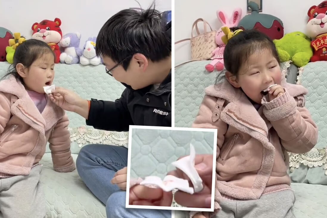 Trong video, hai bố con ngồi ở ghế sofa. Cầm sẵn miếng khăn giấy và hô to con gái há miệng ra để nhổ răng, nhưng tay người đàn ông run run, không dám thực hiện.