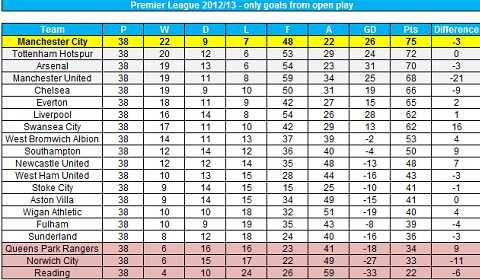 | Bảng xếp hạng Premier League nếu bỏ qua những bàn thắng đến từ các pha bóng cố định |