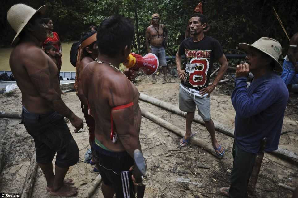 Các chiến binh Munduruku đang yêu cầu một nhóm thợ khai thác vàng lậu (hai người đàn ông mặc áo ngoài bìa phải) phải rời ngay khỏi vùng đất của họ.