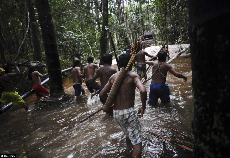 - Một nhóm chiến binh Munduruku đang tập trung tại làng Retiro das Cobras, gần sông Kadiriri trên lãnh thổ Brazil, trước khi tiến hành một cuộc tuần tra săn đuổi những kẻ khai thác vàng lậu trên đất đai của họ.