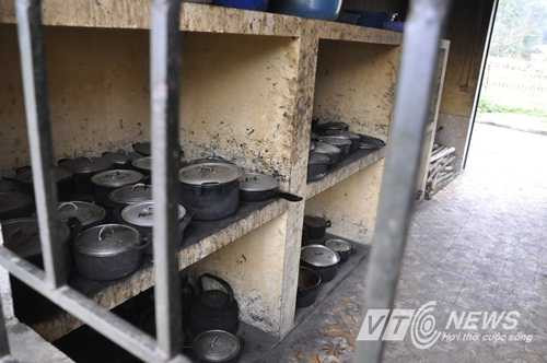 | Nồi nấu của các em học sinh xếp ngay ngắn trong nhà bếp |