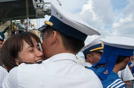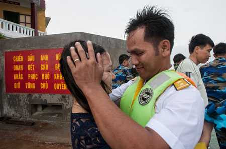 "Chúng tôi hết sức cảm động với sự chăm sóc của đội ngũ nhân viên trên tàu HQ-571. Khi chúng tôi say sóng không ăn được cơm, các anh chị đã lấy thêm cơm cháy, cháo, thậm chí lục trong kho ra những củ khoai lang cuối cùng để nướng cho chị em ăn lấy sức", chị Trịnh Thị Thủy, ra thăm chồng là Trung úy Hoàng Cao Cường tại điểm C đảo Đá Tây, xúc động tâm sự. "Lúc chia tay, các anh trên đảo nói khóc đi nhé, khóc đi nhé. Mình nói với các anh là không khóc đâu. Nhưng khi đặt chân xuống xuồng, nước mắt cứ thế trào ra, không nỡ rời xa đảo. Khi lên tàu, nhận được sự quan tâm của các anh chị trên tàu, mình mệt thì mệt, nhưng xúc động mà nước mắt cứ trào ra mãi".