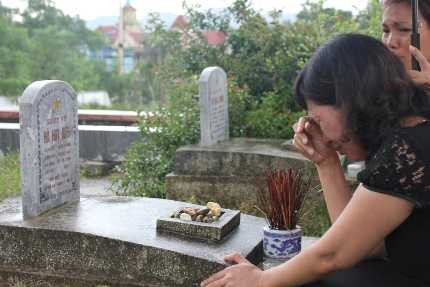| Con gái Liệt sỹ Hà Hiếu xúc động bên phần mộ ba mình. |