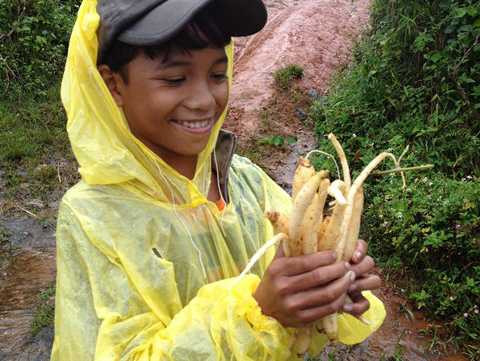 Trong hơi lạnh căm căm, các em nhỏ chỉ mong manh một cái dù cũ kĩ và tấm bạt ni lông để quấn quanh thân. Hít hà trong mờ sương nơi vùng cao, em A Vui (8 tuổi, học sinh lớp hai, trường tiểu học Đắk Trăm) nói: “Tranh thủ ngày hè được nghỉ học, cả nhà em cùng vào rừng, lên rẫy để kiếm sản vật của rừng leo lên đỉnh ngồi bán thì mới đông người mua”. Nhà em ở dưới đỉnh đèo, ẩn hiện giữa rừng già xa xa. Khi khách hỏi mua củ sâm đắng, em vào rừng để tìm, cứ vài củ là được vài chục nghìn đồng.
