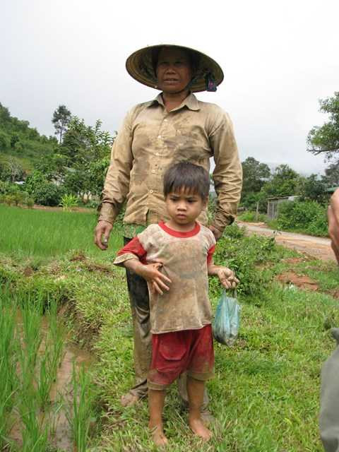 Trước khi lên đỉnh đèo, chúng tôi chú ý đến hình ảnh một người mẹ lam lũ đang mạ lúa bên cạnh đàn con nhỏ lít nhít. Dưới vành nón lá và bộ quần áo lao động tơi tả, người mẹ cho biết tên là I Diệu (SN 1969, người Xê Đăng). Chị là người bản địa dưới đại ngàn Trường Sơn hùng vĩ.