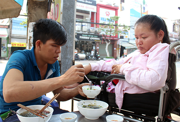 Một năm bên nhau, Trí không thấy mình vất vả hơn. Ngoài vợ, anh còn đảm nhiệm việc bế thêm một chị khuyết tật trong nhà lên xuống xe lăn mỗi ngày. Trong nhà lúc nào cũng rộn tiếng cười mỗi khi anh đi làm về. Rảnh rỗi, anh lên mạng, học nấu các món ăn ngon đãi vợ.