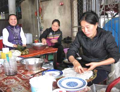 Kế bên chị Vinh là cô “em thứ” tên Trần Thị Lâm (43 tuổi) tay thịt tay dao nhuần nhuyễn với những động tác điêu luyện để cắt thịt, pha chế gia giảm. Khó khăn nhất, vất vả hơn cả là công việc rán bánh của “em út” tên Lê Thị Tịnh. Chưa ăn, nhưng nhìn vẻ hài lòng của khách, chúng tôi cũng hiểu được phần nào lời “quảng cáo” của một vài người bạn là đáng tin cậy.